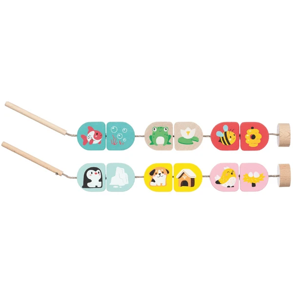 Ein Spielzeug, bei dem dein Kind Figuren an einem Seil aufreihen muss, die dem