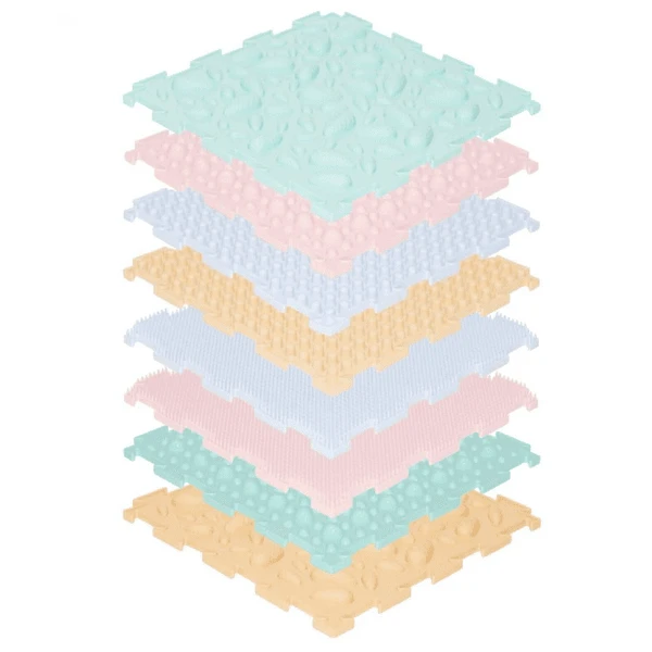 Orthopädische Sensomotorik MatteDieses Basic Set ist eine aufeinander abgestimmte Kombination aus weichen und harten Oberflächen.Die Module mit harten Oberflächen stimulieren und stärken das Fußgewölbe. Durch den angenehmen Reiz werden wenig ausgeprägte Muskeln aktiviert und gestärkt.Weiche Oberflächen stimulieren und massieren die Füße sanft. Die Abwechslung sorgt für die bessere Balance und trainiert das Gleichgewicht bei den Kleinen.Unsere orthopädische Matten imitieren die unterschiedlichen Untergründe der Natur: Gras, Kiesel, Äste. Barfuß betreten die Kleinen die Matten und setzen sich mit diversen Reizen auseinander.Die abgerundeten Noppen streicheln, massieren und stimulieren Reflexzonen auf der Hautoberfläche. Das Kind arbeitet nur mit dem eigenen Gewicht und lernt dabei sein Körper zu beherrschen, trainiert das Gleichgewicht und Koordinationsfähigkeit.Alle Module passen wie ein Puzzle zusammen, sodass das Kind sie nach Belieben zusammenstellen kann. Gleichzeitig wird seine Feinmotorik und taktile Wahrnehmung in den Händen trainiert.Die Strukturmatten unterstützen die Entwicklung der körperlichen und kognitiven Funktionen und sind ein wesentliches Hilfsmittel in der Ergo- und Physiotherapie.Größe der Einzelteile: 25 x 25 cm.Set beinhaltet 8 Module:2x Dornen weich2x Zapfen weich2x Kiesel weiсh2x Gras weich
