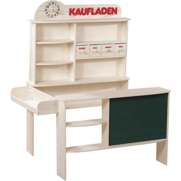 - Inhalt: Verkaufsstand, Uhr mit beweglichen Zeigern, mit integrierter Tafel, 4 Holzschubladen und seitlicher Ablage