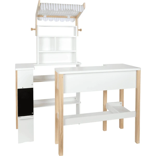 - Dieser kompakte Kaufladen mit abnehmbarer Stoffmarkise passt sich durch sein durchdachtes Raum-in-Raum-Konzept dem Platzangebot im Kinderzimmer flexibel an